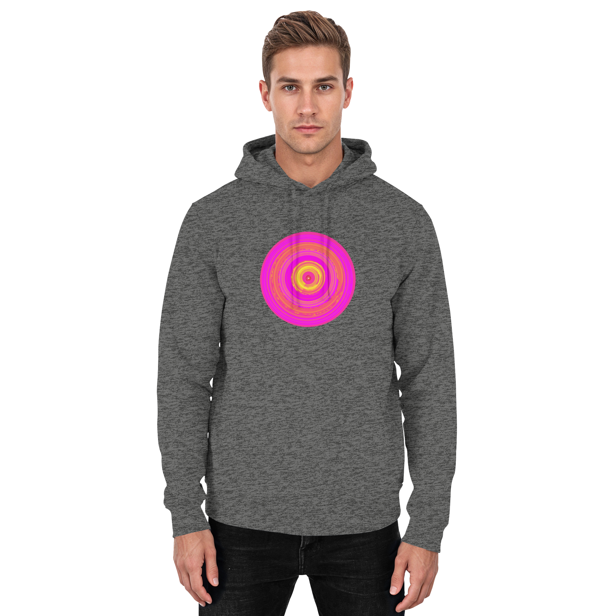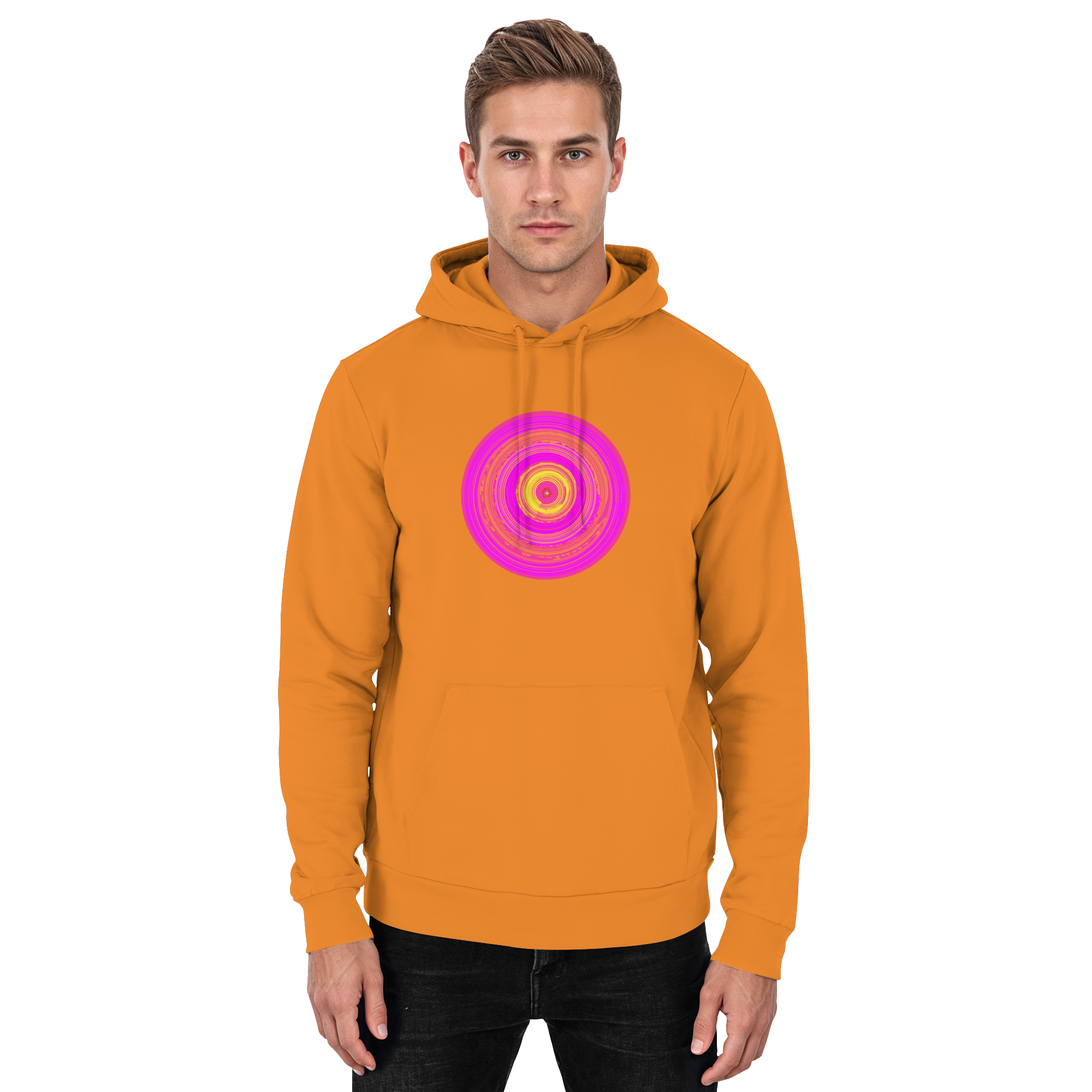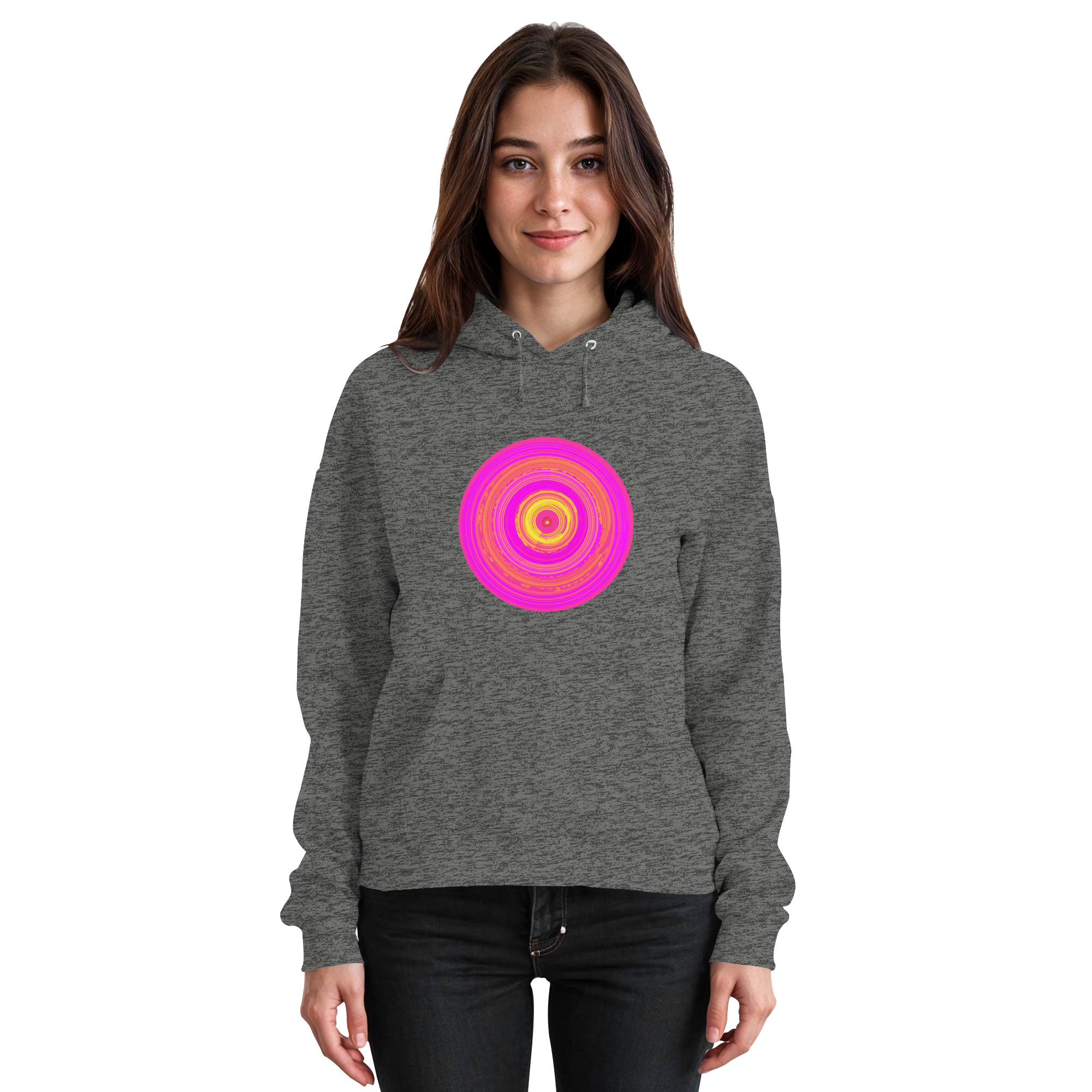 „Sunwheel“ ist ein Sinnbild innerer Strahlkraft. Der knallig-pinkfarbene Kreis steht für Herzensenergie und kreative Kraft mit orange-gelbem Sonnenwirbel.